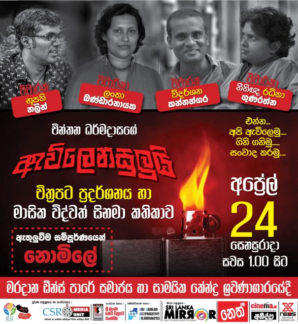 මේ චිත්රපටය නරඹන්නත්, ඒ පිළිබඳව කතාබහකට එක්වන්නත් ඔබටත් විවෘත ආරාධනයක් තිබෙනවා. අප්රේල් 24 වැනි සෙනසුරාදා සවස 1.00ට චිත්රපටය නරඹන්නත් ඉන් පස්සේ ඒ ගැන සංවාදයට එකතු වෙන්නත් අවස්ථාව තිබෙනවා. මෙවර සංවාද මණ්ඩපය නියෝජනය කරන්නේ බූපති නලින්, විදර්ශන කන්නන්ගර, ලංකා බණ්ඩාරනායක සමගින් රධිකා ගුණරත්න.