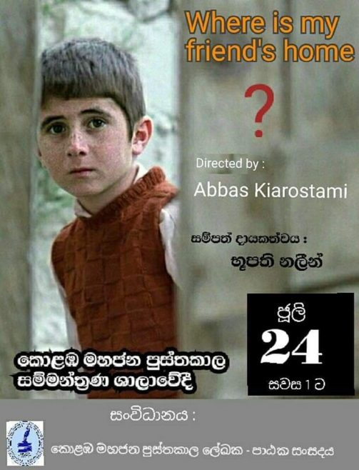 Abbas Kiarostami සිනමාවේදියා නිර්මාණය කළ “Where is my friend’s home” චිත්රපටය මෙවර තිරගත කිරීමට නියමිතයි. චිත්රපටයෙන් පසුව සිනමා සංවාදයක් පැවැත්වෙනවා. සිනමා විචාරක භූපති නලින් ඒ සඳහා සම්පත් දායකත්වය ලබාදීමට නියමිතයි. මහජන පුස්තකාල සම්මන්ත්රණ ශාලාවේදී මෙම වැඩසටහන පැවැත්වෙනු ඇති.