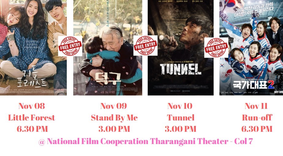 මෙම සිනමා උළෙල සම්පුර්ණයෙන්ම නොමිලේ පැවැත්වෙන්නක්. කොරියානු සිනමාව රසවිඳීමට 8 වැනිදා සිට 11 වැනිදා දක්වා තරංගනී සිනමාහලට පැමිණෙන ලෙස කොරියානු තානාපති කාර්යාලය ඇරියුම් කරනවා.