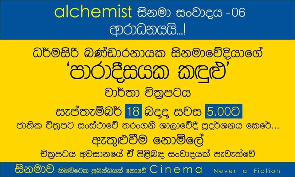 ධර්මසිරි බණ්ඩාරනායක නිර්මාණය කළ වාර්තා චිත්රපටය “පාරාදීසයක කඳුළු” තිරගත කිරීම සහ ඒ පිළිබඳව සංවාදයක් පැවැත්වීමේ වැඩසටහනක් සංවිධාන කොට තිබෙනවා. Alchemist සිනමා සංවාද වැඩසටහනේ 06 වැනි පියවර ලෙසිනුයි මෙය සංවිධානය වන්නේ.
