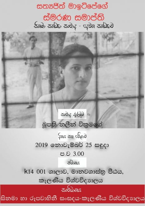 මෙවර ඔවුන් තෝරාගෙන තිබෙන්නේ සත්යජිත් මාඉටිපේ නිර්මාණය කළ “ස්මරණ සමාප්ති” චිත්රපටය. නොවැම්බර් මස 25 වැනිදා සඳුදා, සවස 3.00 සිට මේ වැඩසටහන පැවැත්වෙනවා. මානව ශාස්ත්ර පීඨයේ K14 001 ශාලාවේදී සිනමා දැක්ම සහ සංවාදය පැවැත්වෙනු ඇති. සංවාද ප්රවේශය බූපති නලින්ගෙන්.