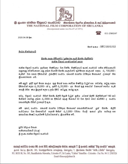 එසේම චිත්රපට සංස්ථාව මගින් සිනමා ශිල්පීන් 160 දෙනෙකු සඳහා මාසිකව ගෙවනු ලබන රුපියල් 5000/= ක විශ්රාම වැටුප් දීමනාව අදාළ මාසයේ 03 වැනි දිනට ප්රථම ගෙවීමටද සභාපතිවරයා දැනුම්දුන් බව චිත්රපට සංස්ථාව නිකුත් කළ නිවේදනයේ සඳහන් වනවා.