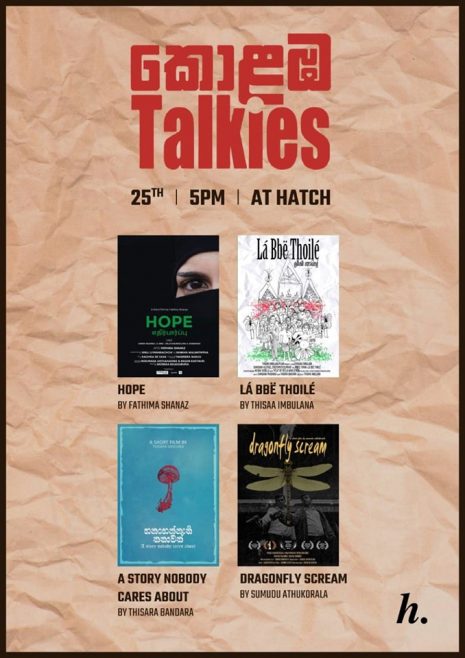 Colombo Talkies කණ්ඩායම මෙවර කෙටි චිත්රපට හතරක් ප්රදර්ශනය කිරීමට සැලසුම් කොට තිබෙනවා. ජූලි 25 වැනිදා, බ්රහස්පතින්දා සවස 5 සිට මේ වැඩසටහන පැවැත්වීමට නියමිතයි.