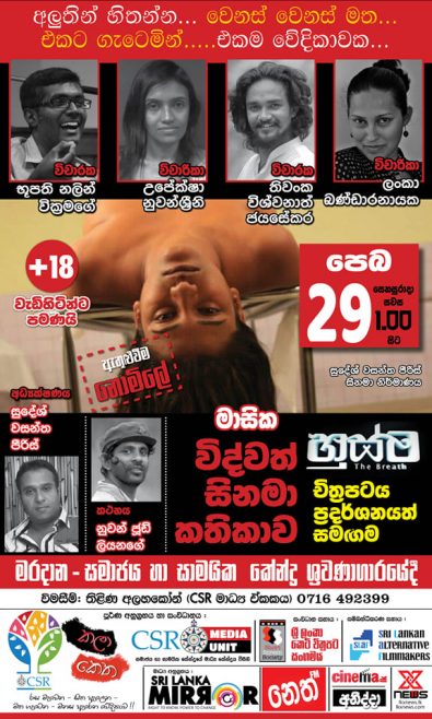මාසිකව සෑම මසකම අවසන් සෙනසුරාදා දින නවතම සිංහල චිත්රපටයක් ප්රදර්ශනය කර එම උණුසුමෙන්ම පේ්රක්ෂක විචාරක සංවාදයකට මුල පුරණ ආකාරයේ ආකෘතියක් සහිත ‘‘ CSR මාසික විද්වත් කතිකාව’’ මෙවරත් පැවැත්වෙනවා. වැඩසටහනේ පෙබරවාරි කලාපය සදහා සිනමාවේදී සුදේශ් වසන්ත පීරිස් විසින් අධ්යක්ෂණය කරනු ලැබූ ‘‘හුස්ම’ සිංහල චිත්රපටය සම්බන්ධ විද්වත් සිනමා කතිකාවක් පැවැත්වීමට සූදානම්. පෙබරවාරි 29 වන සෙනසුරාදා සවස 1.00 සිට මරදාන ඩීන්ස් පාරේ සමාජය හා සාමයික කේන්ද්රයේ ශ්රවණාගාරයේදී මේ වැඩසටහන පැවැත්වෙනවා.